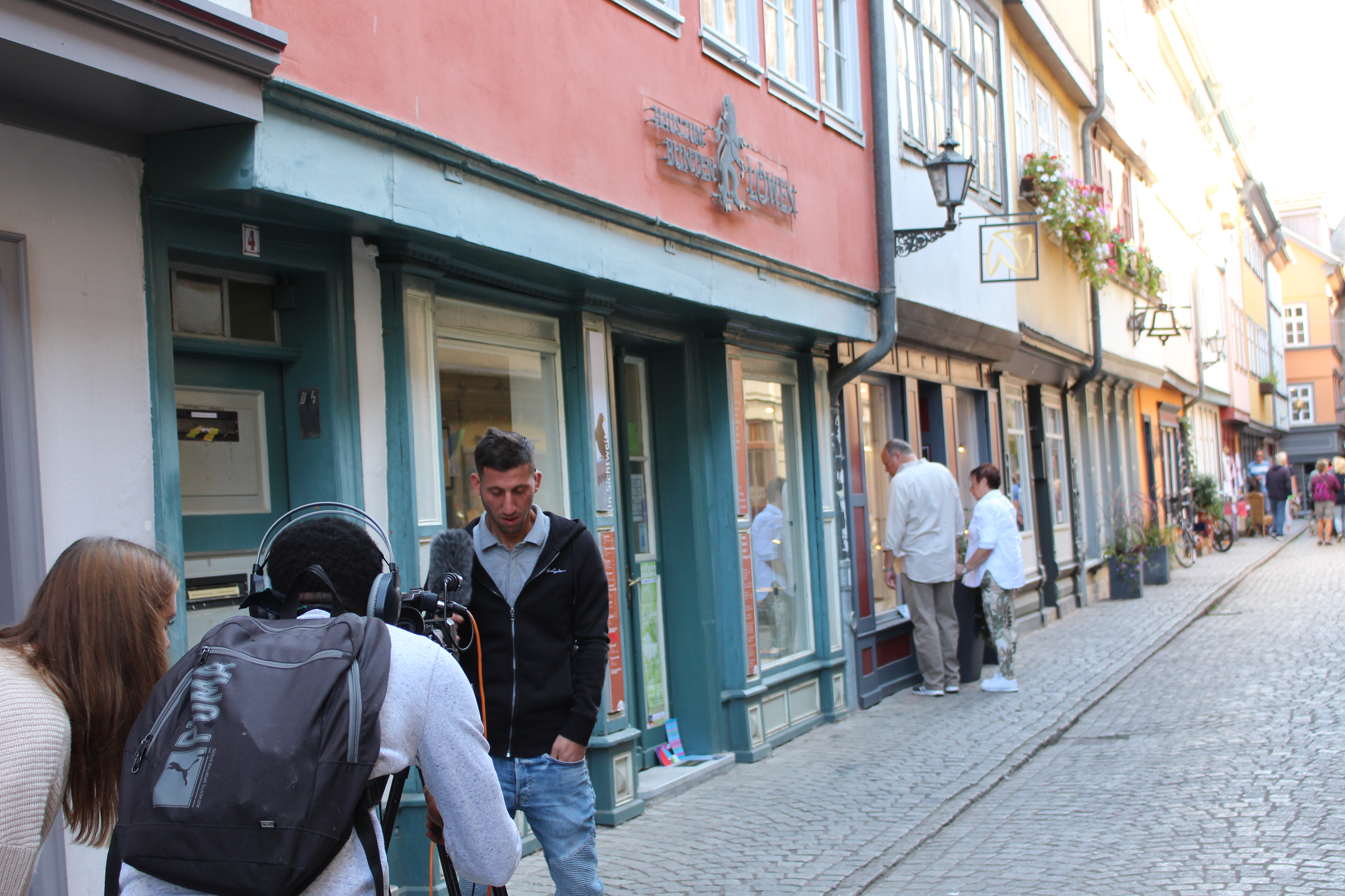 Am dritten Projekttag teilten wir uns für unsere Stadtführung in Gruppen ein. Jede Gruppe wählte sich selbstständig eine Sehenswürdigkeit aus, welche sie ihren Mitschüler*innen am finalen Projekttag vorstellen möchte. Wir durften nun in Eigenregie, Fotos und Videos von unserer gewählten Sehenswürdigkeit aufnehmen. Hierbei war es uns möglich, unserer Kreativität freien Lauf zu lassen und zuvor gelernte Techniken, wie beispielswese die Schwenkaufnahme bei Videos gekonnt umzusetzen. Außerdem führten wir Interviews mit Passant*innen in der Innenstadt durch, um herauszufinden warum sie den jeweiligen Ort besuchen.