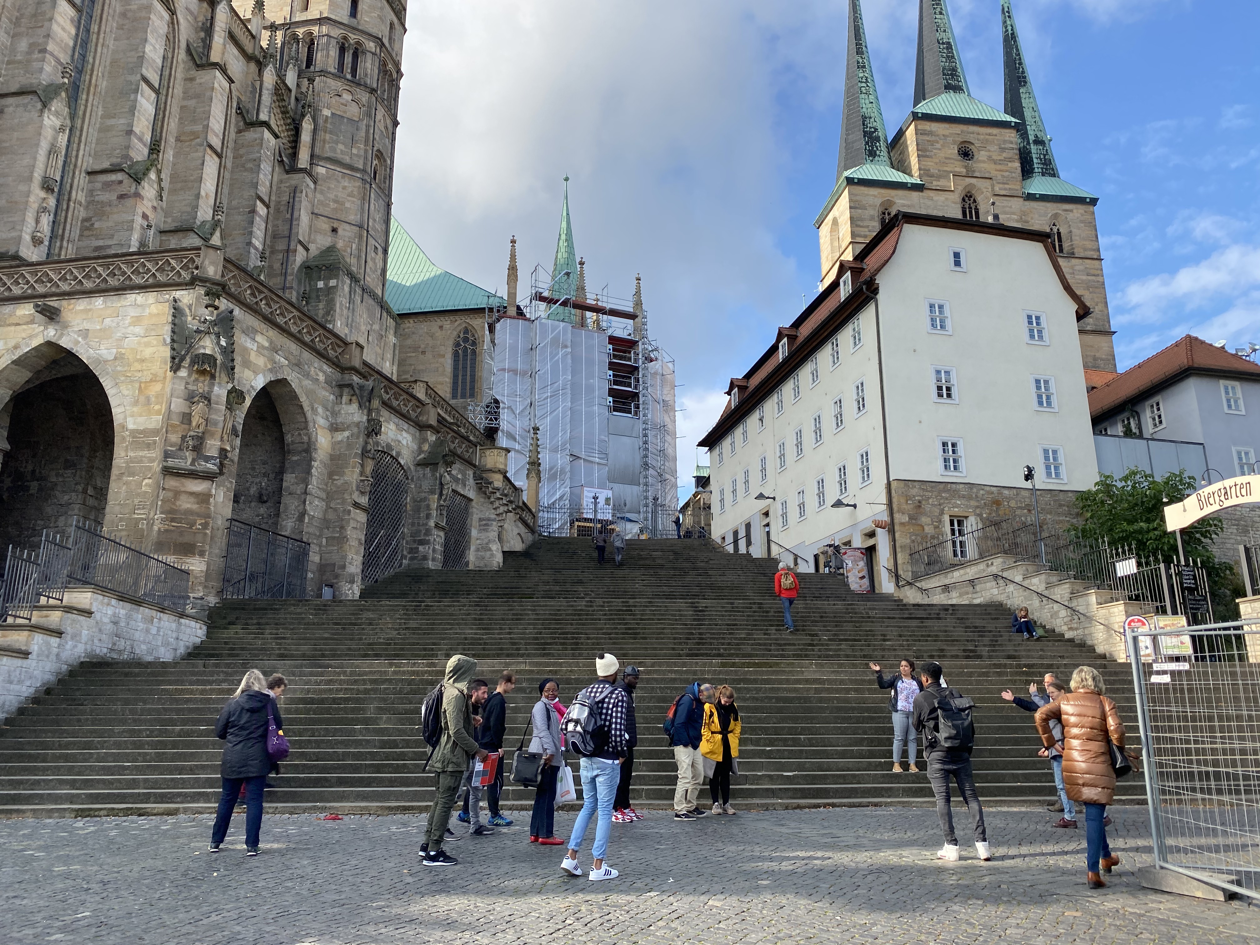 Heute ist der letzte Tag unseres City Bound Projekts und alle Gruppen stellen ihren Ort persönlich vor. Dafür haben wir uns schon am Morgen im Gruppenraum des Landesfilmdienst e.V. getroffen, um unseren Tag noch einmal zu planen. Dann ging es schon los, wir sind zu erst zum Domplatz gelaufen. Dort haben wir von der Gruppe viele interessante Fakten über den Dom erfahren. Danach führte uns der Weg zum Naturkunde Museum und wir durften sogar mal reinschauen. Unser letzter Ort war die Krämerbrücke. Wusstest du, dass sie die längste, mit Häusern bebaute Brücke Europas ist?